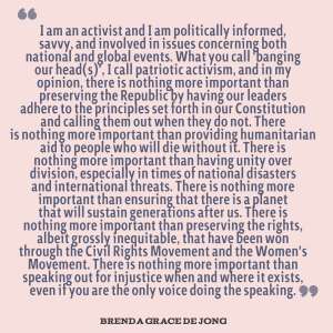 Brenda Grace de Jong is the author of several short stories and pieces of flash fiction, along with her recently published book, "My Name is Elpee: A Trilogy". Ms. de Jong holds an M.S. degree in Human Services Leadership and Management and has worked with populations that include: victims of domestic violence, substance abusers, people affected by mental illness, individuals with HIV/AIDS and nursing homes residents desiring to return to the community. With a minor in Women's Studies, Brenda has, for several years, set about the task of mentoring women in various capacities, especially in the areas of education and empowerment. As a devout student of the Universe, Ms. de Jong maintains a daily vigil of sustaining and furthering her spirituality, especially within nature. She is an avid barefoot, tree-hugging, candle-lighting, ceremonialist, who conducts full-moon, solstice and equinox ceremonies, individually and with groups on Long Island and at her home on Fire Island. Having lived both a very conventional existence followed by an unorthodox and checkered lifestyle, Ms. de Jong has been known, over a cup of tea, to share some of her secrets with certain people; other secrets, however, she will simply smile while thinking about, but will discuss only with those who helped make those stories. You can connect with her on Facebook, LinkedIn, and about.me. View all posts by cherrycottagefi
